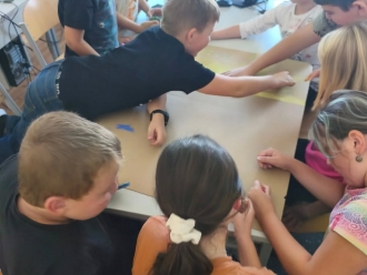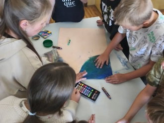 Naši čtvrťáci dostali zapeklitý úkol - museli ve dvou týmech vytvořit dva obrazy a na všem se společně domluvit. Téma, barva, velikost, čím a jak... Těžký úkol, ale děti se k tomu postavily statečně a vytvořily dva krásné obrazy. Tvorbu provázely silné emoce. Mluvili jsme o nich společně. Reflektovali, jak se nám pracovalo a měli radost, že jsme to, byť to bylo chvilkami složité, dokázali.