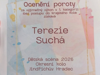 19. 2. se Zuzanka Březovská, Terezka Suchá, Anetka Oušková a Ema Buštová zúčastnily okresního kola recitační soutěže v J. Hradci. Holky předvedly skvělé výkony, nasbíraly nové zkušenosti, dostaly tipy, jak mohou na sobě pracovat a T. Suchá si odnesla ocenění v první kategorii. Všem moc gratulujeme.